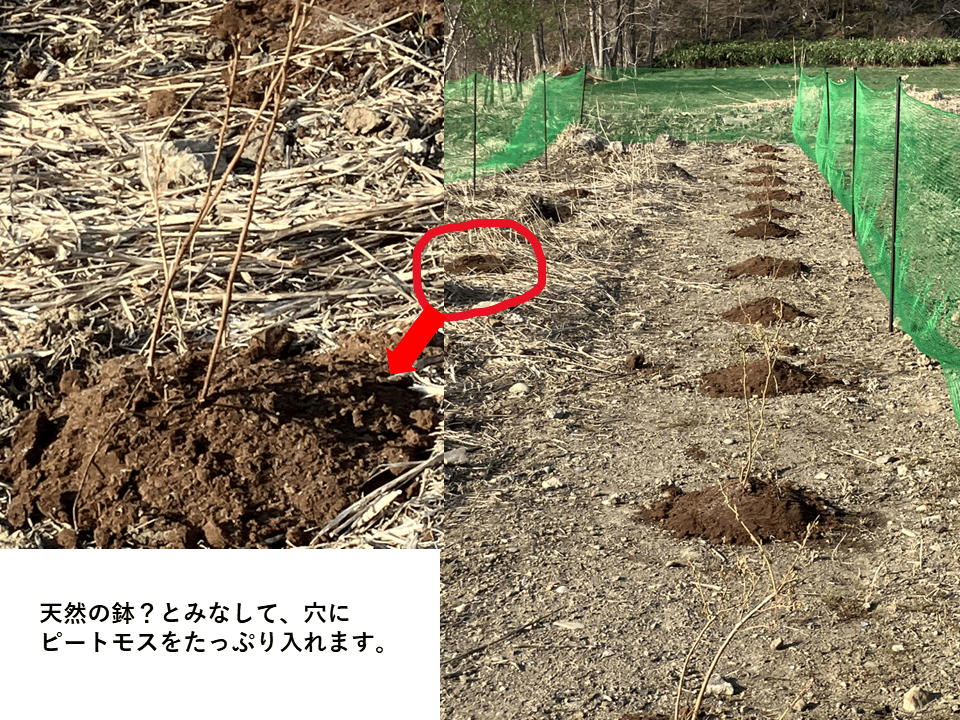 ブルーベリーはピートモスのみを穴の中にたっぷりと入れて、挿し木後2年間育てた苗を定植しています。2年間は鉢で育ててあげないと、移植しても勢いがなく、大きくなるのに時間がかかるようです。1年めは、しっかり活着した頃に、ほんの少しだけ肥料をあげています(硫安をひとつまみくらい)。