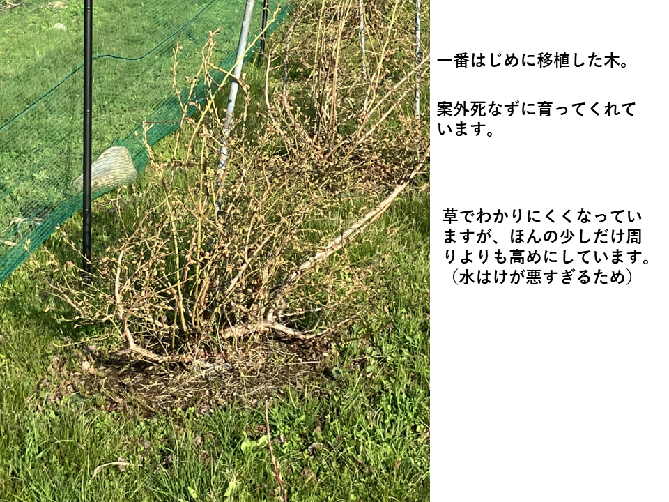 水はけが悪い場所なので、少しだけ高くなるようにしているのが功を奏しているのか、かなり周囲に水がたまっている時でも、ブルーベリーはすくすく育っています。下の写真は一番はじめに移植した木です。どのくらいの実がつくか楽しみにしながら夏までお世話したいと思います。