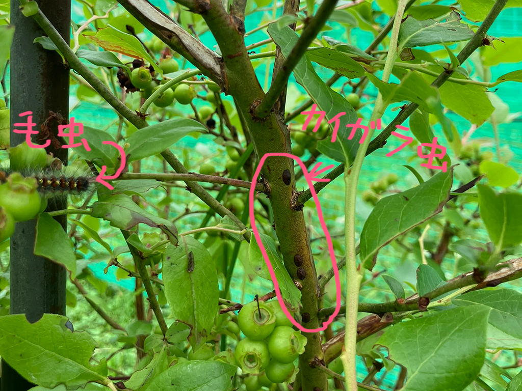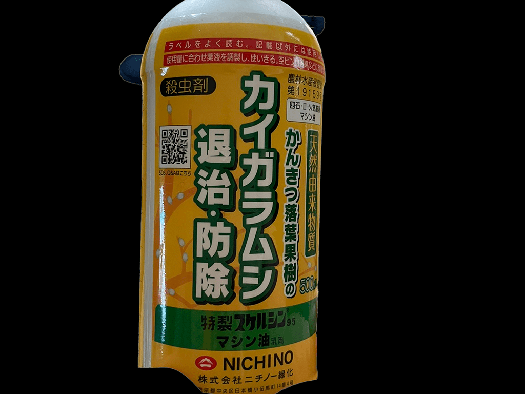 これは、早めになんとかしなくては・・・と思い、近くのホームセンターにいくと、今度はブルーベリーに使えて、なおかつ有機農業でも使える「マシン油」がありました。早速購入して20倍希釈で散布しました。この薬は油の膜効果でカイガラムシを窒息させるようです。少し薬害が心配だったのですが、まずはかけてみようということで。ついでに取り残してしまった毛虫にもかけておきました(一応嫌がっていた)。