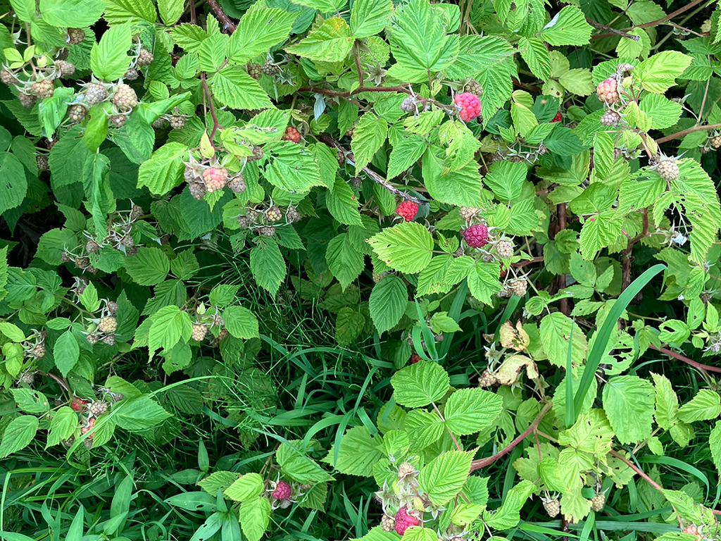 この場所は水はけが悪く、粘土質なので、一度直接ラズベリーを植えたら枯れてしまったため、現在は幅1mほど、高さ20cmほど土を入れて育てています。これが功を奏して非常に収穫しやすいです(今は茎が茂っていて見にくいので、収穫が終わったら画像をアップしますね)。