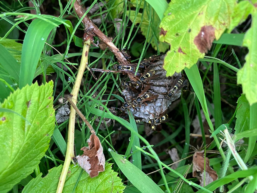 ここにいるのは、アシナガバチの仲間のようです。ラズベリーを植えている場所には、5個ほど巣があります。巣の近くに行かない限りはおとなしくしているので刺激しないように、仲良く付き合いながらの収穫です。・・・が赤い実を探して夢中になっていると、巣の場所を忘れて近づいてしまうため、ハチが抗議に来ています。ハチも家を守るのに必死のようです。