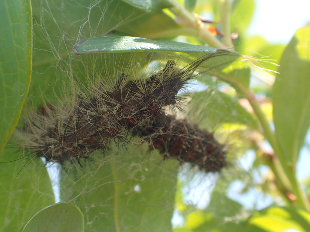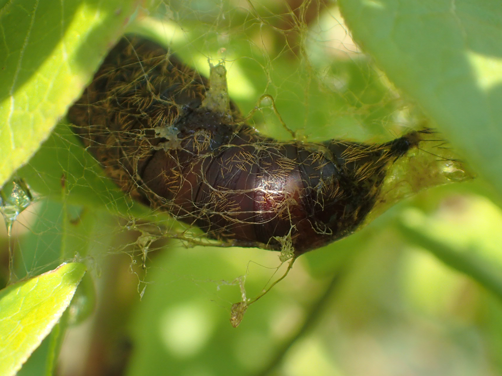 そして、おそらくマイマイガだと思われる毛虫の生き残り。もう終齢幼虫で葉っぱもあまり食べていないので殺すのはやめていたら、さなぎを形成中でした。