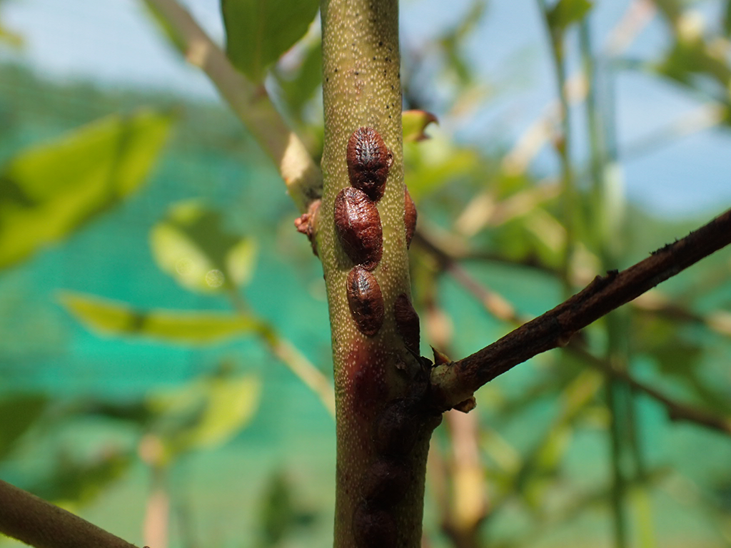 そしてブルーベリーのところにいる虫たちもとってみました。虫が嫌いな人はごめんなさい。まずカイガラムシです。これは多分マシン油で死んでいる?と信じています。