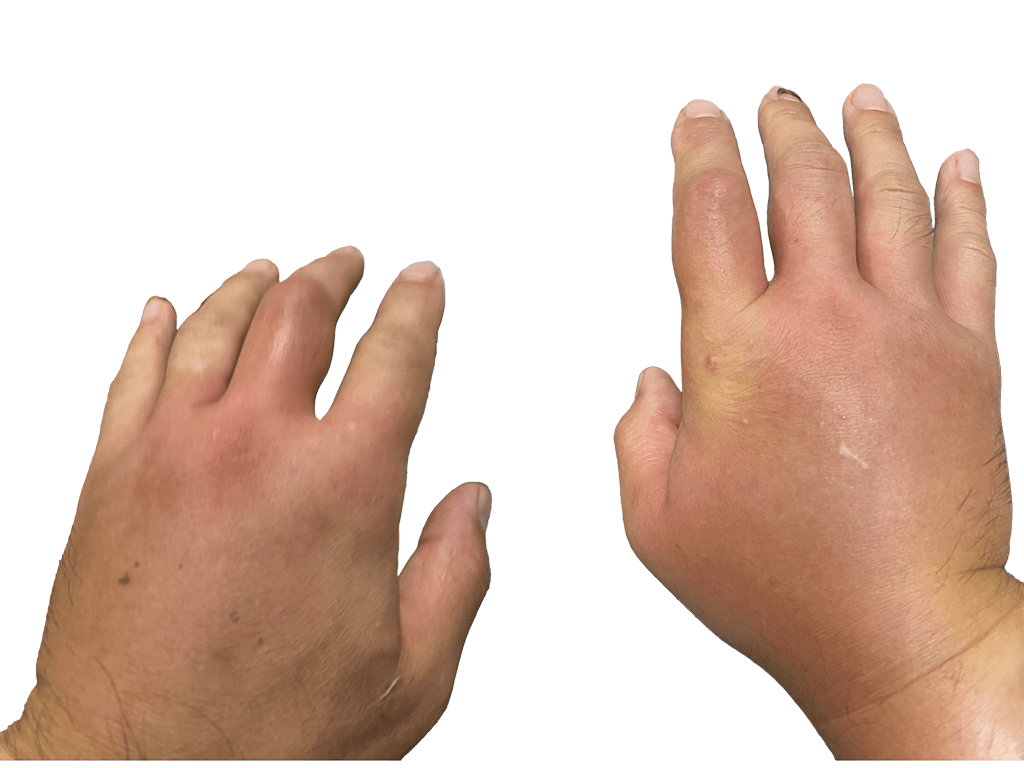 下の写真が次の日の状況です。赤ちゃんの手ではなく、おじさんの手です(毛が生えてるからわかるかも)。あまりにもつらかったそうで病院に行きました。