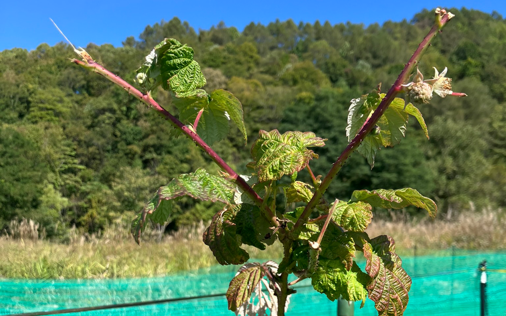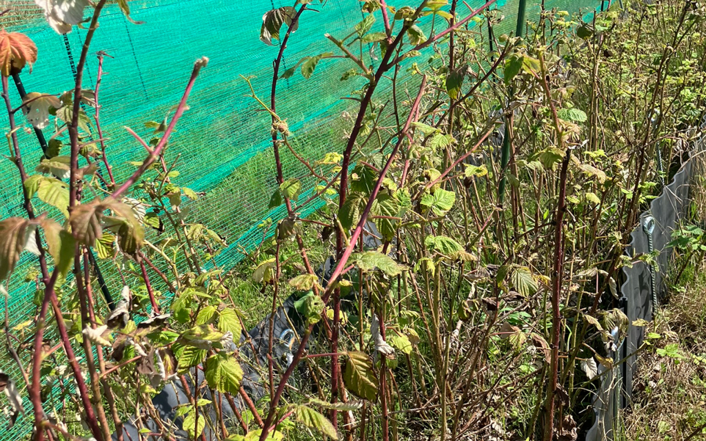 先週畑を見に行ったときは、金テープを張り巡らせたのに、ブルーベリーの一部が鹿にやられており、テンションがだだ下がりでした。ラズベリーもネットがめくれていた近くの一部だけ、シカの食害があったのですが、ネットがめくられないよう石をおいて帰ったので大丈夫だと思って、大きめの袋をもって収穫に行きました。